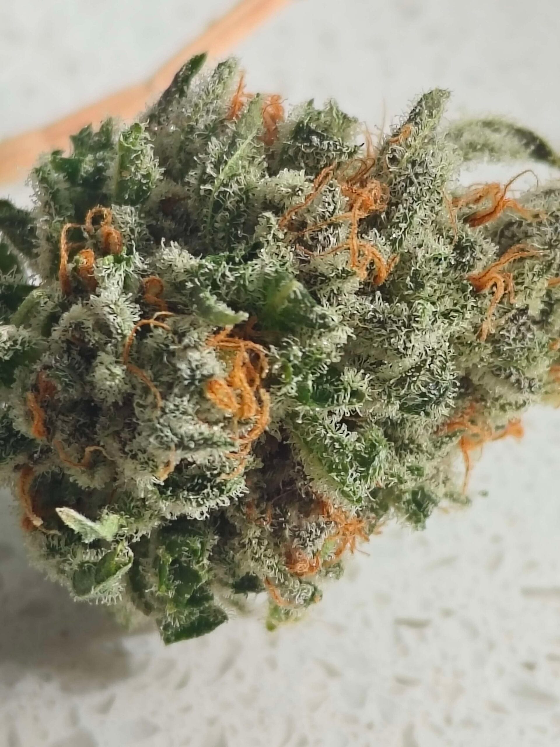 - Colors: Deep green dominant, heavy trichomes, orange pistils